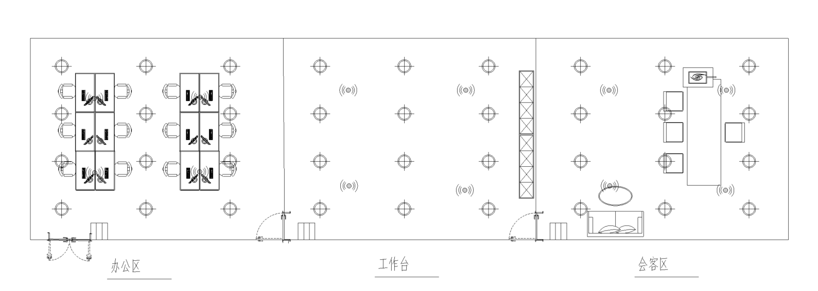 3)工廠分為辦公區、工作臺、會客區,每個區域分別配置物聯網無線控制面板(用一備一),用于切換照明場景。